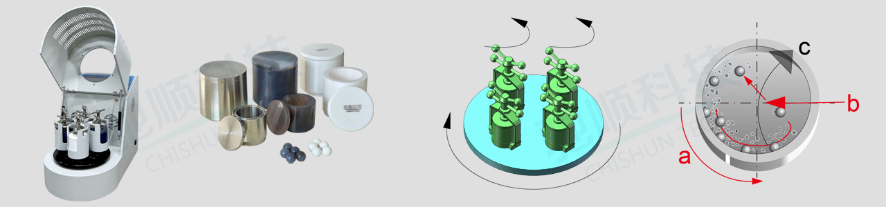 A turntable is equipped with four milling cans. When the turntable rotates, the milling cans revolve both around the wheel axis and on their own axis, like planetary movement. Balls and materials in the cans collide and rub against each other during the high-speed movement so as to achieve the purpose of crushing, grinding, mixing and dispersing samples. This instrument can grind and mix samples of different sizes or materials during dry and wet conditions. The smallest particle discharged is 0.1um (namely1×10mm-4).